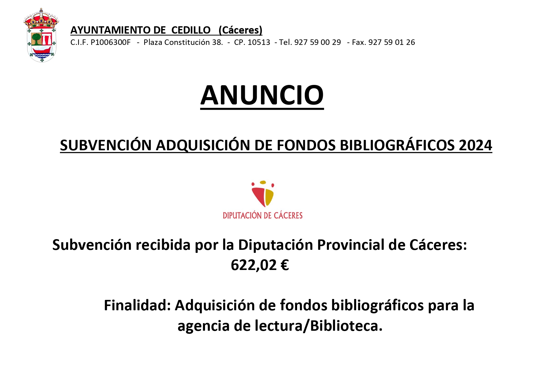 SUBVENCIÓN ADQUISICIÓN DE FONDOS BIBLIOGRÁFICOS 2024- DIPUTACIÓN DE CÁCERES