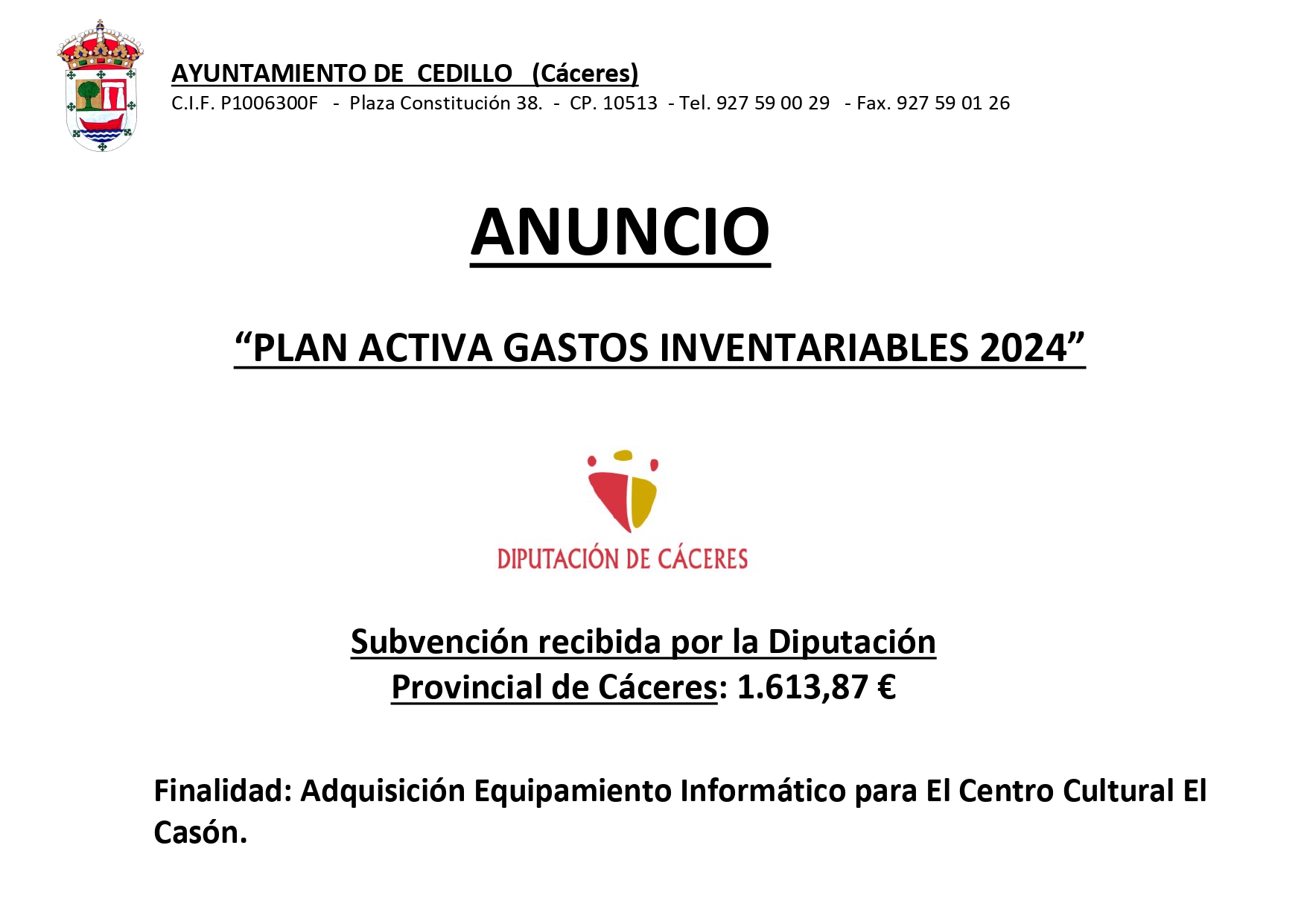 SUBVENCIÓN PLAN ACTIVA GASTOS INVENTARIABLES 2024- DIPUTACIÓN DE CÁCERES