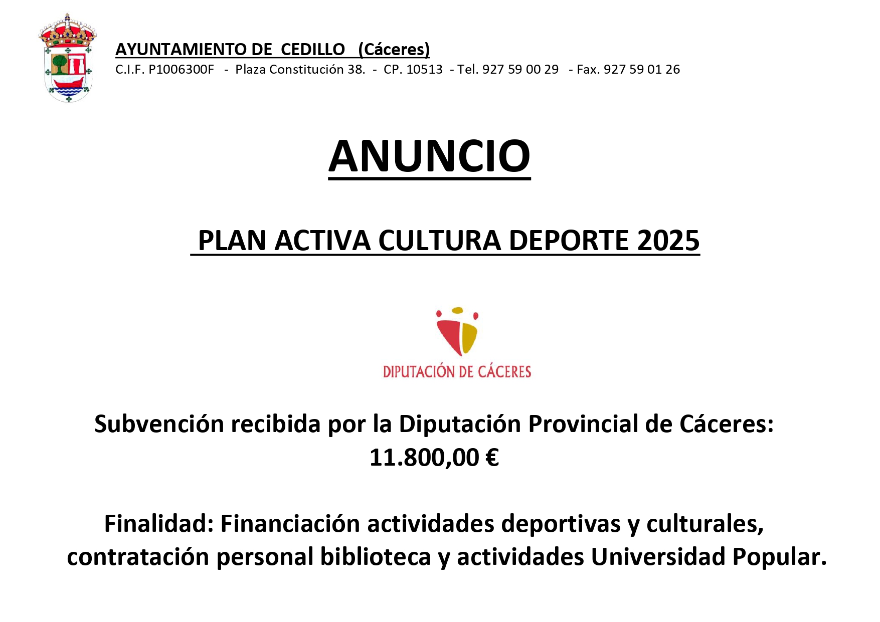 SUBVENCIÓN RECIBIDA PLAN ACTIVA CULTURA DEPORTE 2025